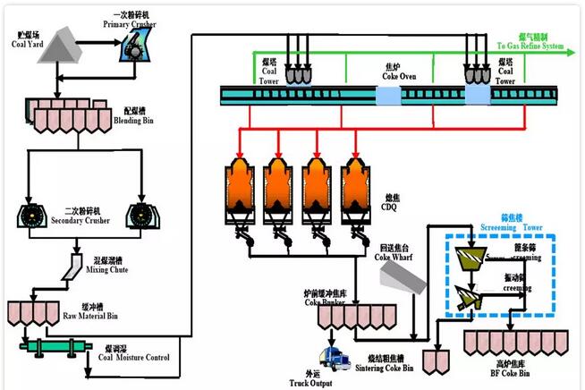 煉焦的目的是生產質優、價廉的冶金焦炭。煉焦同時還能產生焦爐煤氣還能作為燃料。煉焦生產單元一般包括配煤、煤處理、焦爐燃燒、焦爐出爐、熄焦、焦處理等工序。主要原料有:煉焦煤、軟瀝青等。大致工藝流程如下: